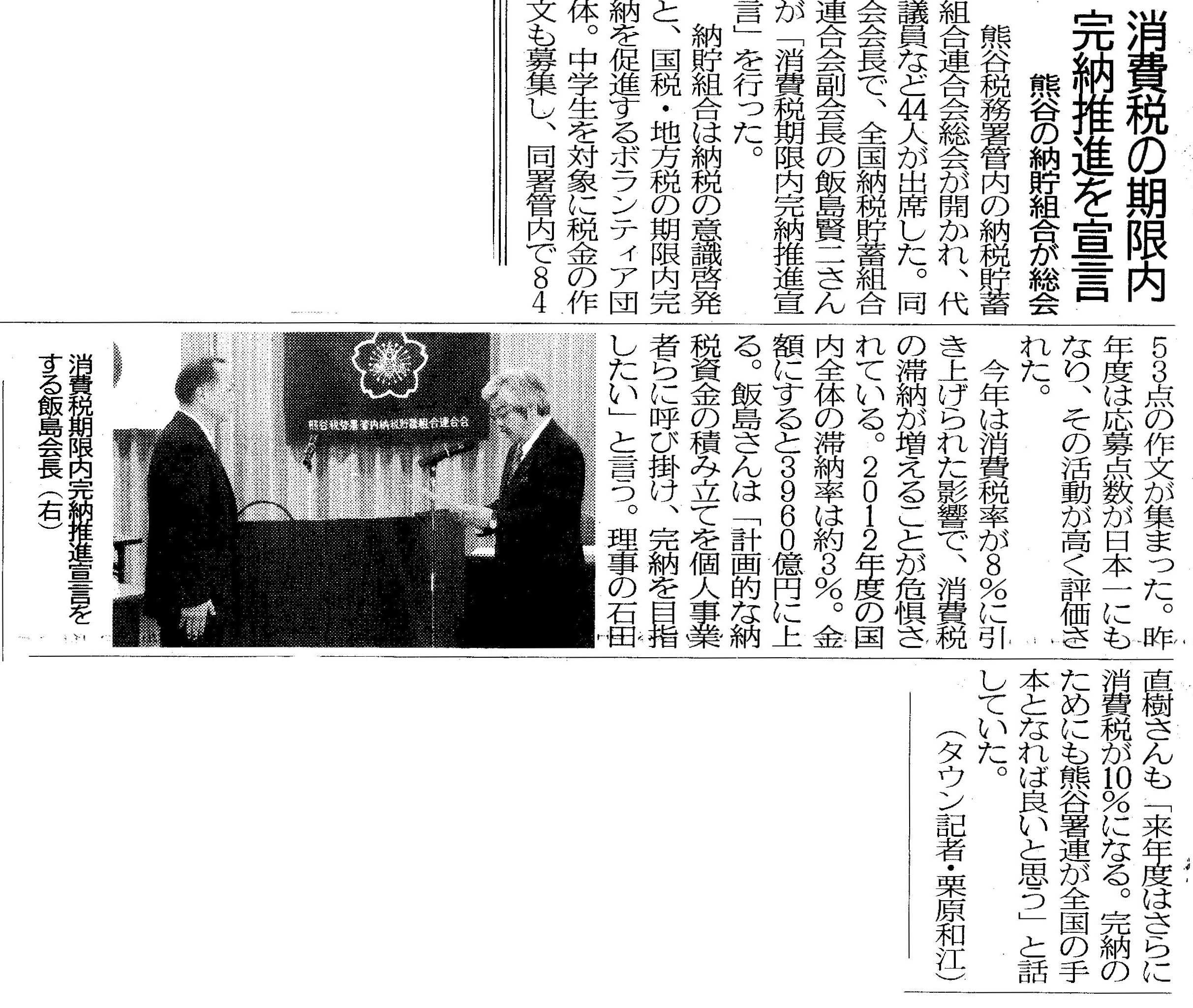 埼玉・熊谷納連が消費税期限内完納を宣言 埼玉県熊谷税務署管内納税貯蓄組合連合会は、5月23日、総会を開き、消費税期限内完納推進宣言を行った。その宣言式が埼玉新聞で報道されたので紹介する。 前の記事 次の記事