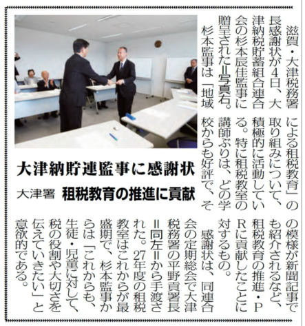 大津納連の杉本さんが税務署長感謝状を受ける ――租税教育の推進活動でーー 滋賀・大津納税貯蓄組合連合会の杉本監事に、租税教育の推進活動で、大津税務署長感謝状が贈られました。 全納連と国税庁が共催で実施している中学生の「税についての作文」事業の後援団体である一般財団法人大蔵財務協会が発行している「週刊 税のしるべ」(平成27年6月22日号、関西版)に掲載されましたので紹介します。 租税教育の推進については、全納連の重点事業となっておりますので、多くの方々の活動が期待されています。 前の記事 次の記事